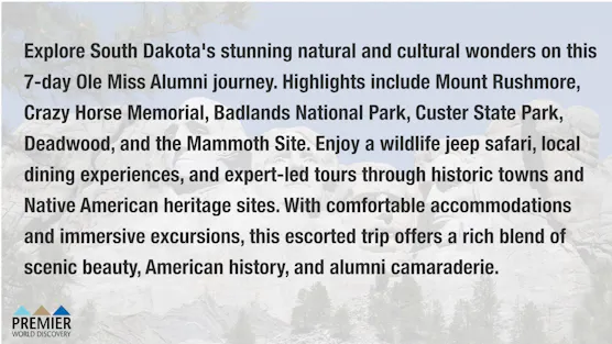 The Ole Miss Alumni Association is pleased to partner with Premier World Discovery to offer opportunities for our Alumni and friends to travel together on journeys around the globe. As a group travel specialist, Premier World Discovery specializes in expertly guided traditional tours, distinctive rail journeys, convenient "unpack-once" single-hotel stays and exclusive river cruise charters.